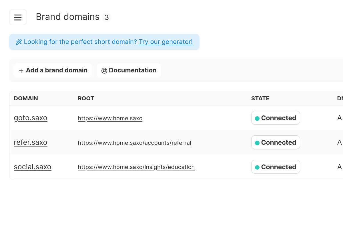 Saxo Bank, fournisseur de solutions de trading et d'investissement multi-actifs, dont l'objectif est de permettre aux personnes curieuses d'investir dans le monde, a choisi de faire de la réduction de lien un pilier de sa stratégie marketing. Avec trois domaines personnalisés et plusieurs milliers de liens réduits par jour, que ce soit via le web ou par API, les liens de Saxo sont plus accessibles et moins suspects dans les SMS ou les emails.